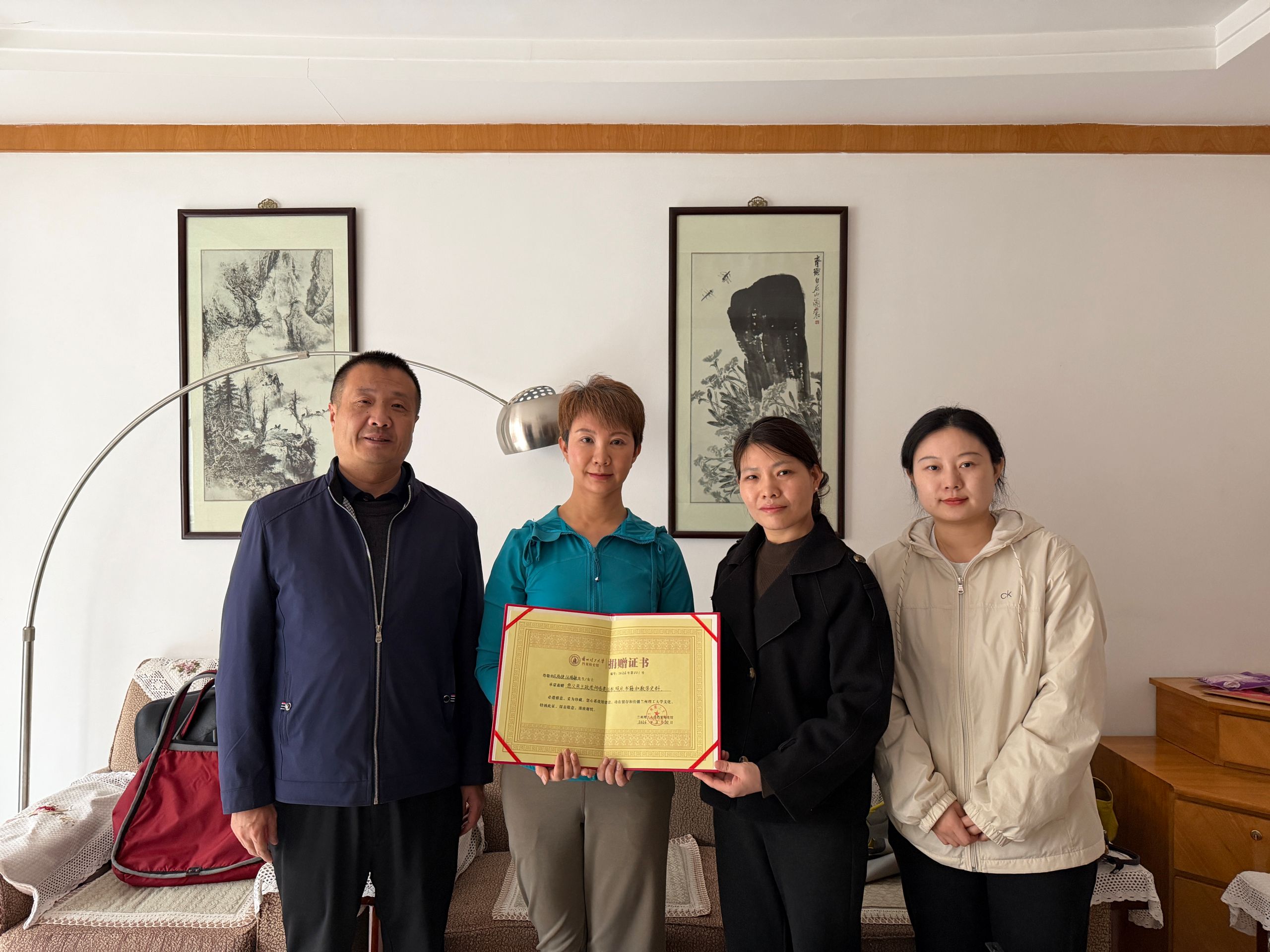 王政老师年事已高不便到场,特委托其子女代为捐赠。王政老师的女儿王瑞敏称:“父亲从教多年,即使退休了,心里也一直装着教育。这些捐出去的东西,不只是一些物件,更是父亲一辈子对知识的敬重,对年轻学生的期许,还有对学校那份化不开的牵挂,这就是老一辈工大人的教育情怀。”档案校史馆副馆长霍明明对王政老师及其家人的慷慨之举表示衷心感谢,并为其颁发捐赠证书。她表示今天的捐赠不仅仅是一次庄重的史料移交,更是一次对历史的深情托付和对校史文化的有力传承,档案校史馆将妥善保管、科学整理、深入研究,以专业的保护、最大限度地发挥其历史价值、文化价值和育人功能。(图/文:李波、陈庆怡,审核:霍明明)